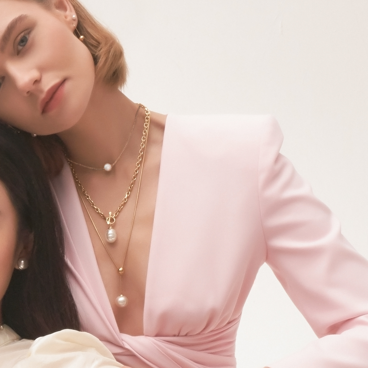 順著西裝外套的衣領而下,單珠項鍊加上一條Y字項鍊,極簡幾何與珍珠的衝突美學,讓人無法輕易移開視線。或者是想嘗試走稍微性感的路線,深V上衣或是小洋裝所露出的光滑肌膚,以多款不同長度的項鍊營造出多層次點綴,性感卻又不失優雅。