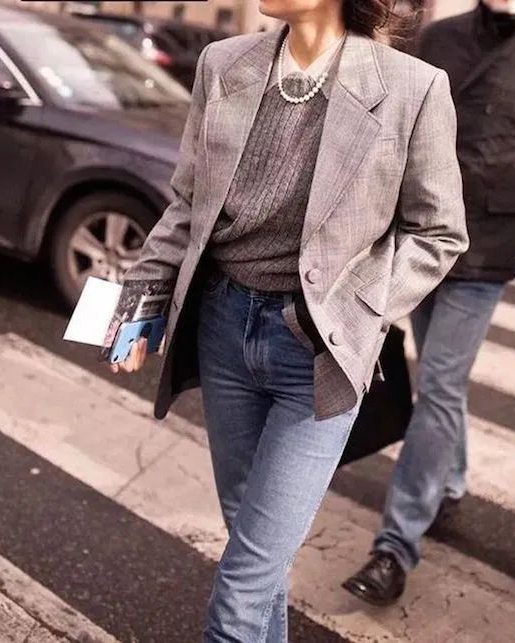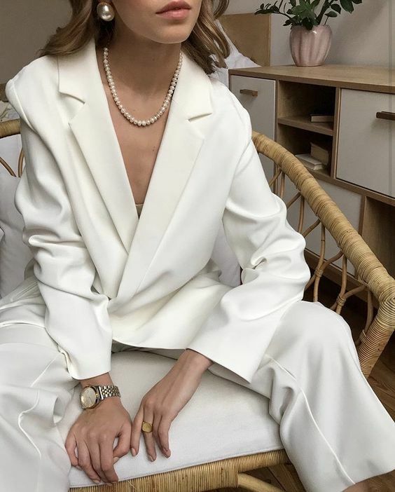 V領上衣很好地展現了女性的鎖骨線條,但卻也讓頸部看起來稍許空蕩。這時戴上一條珍珠項鍊,整體視覺上瞬間多了亮點;襯衫或西裝外套所帶來較為強勢俐落的第一印象,與珍珠項鍊平衡出一種溫柔的和諧感。
