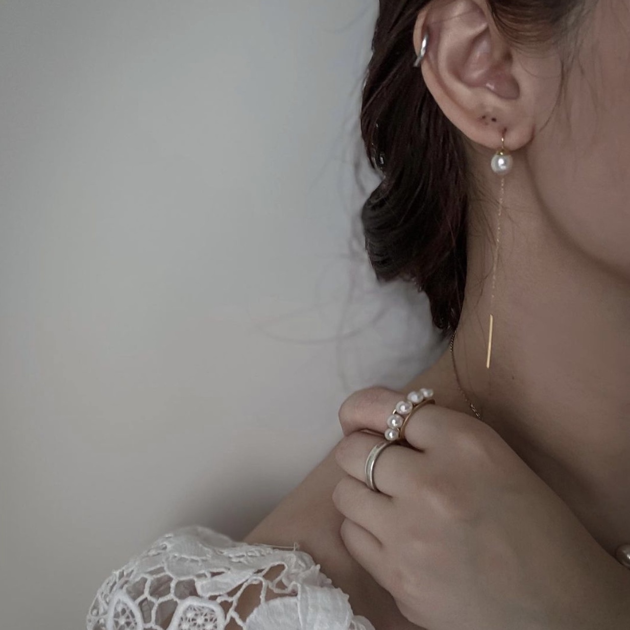 ▋ 蕾絲雕花上衣+珍珠戒指與珍珠耳環
