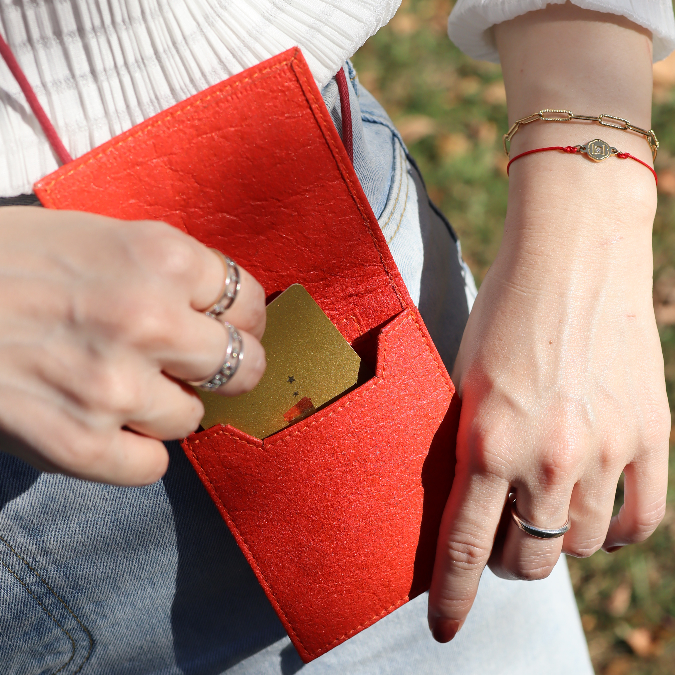 在 ME30 選購永續輕珠寶,除了有減塑環保包裝,更提供「永續 E 包裝」選項,以 Piñatex® 鳳梨纖維皮革素材製成,可作為斜背卡夾再利用,減少環境負擔更增添一份心意!