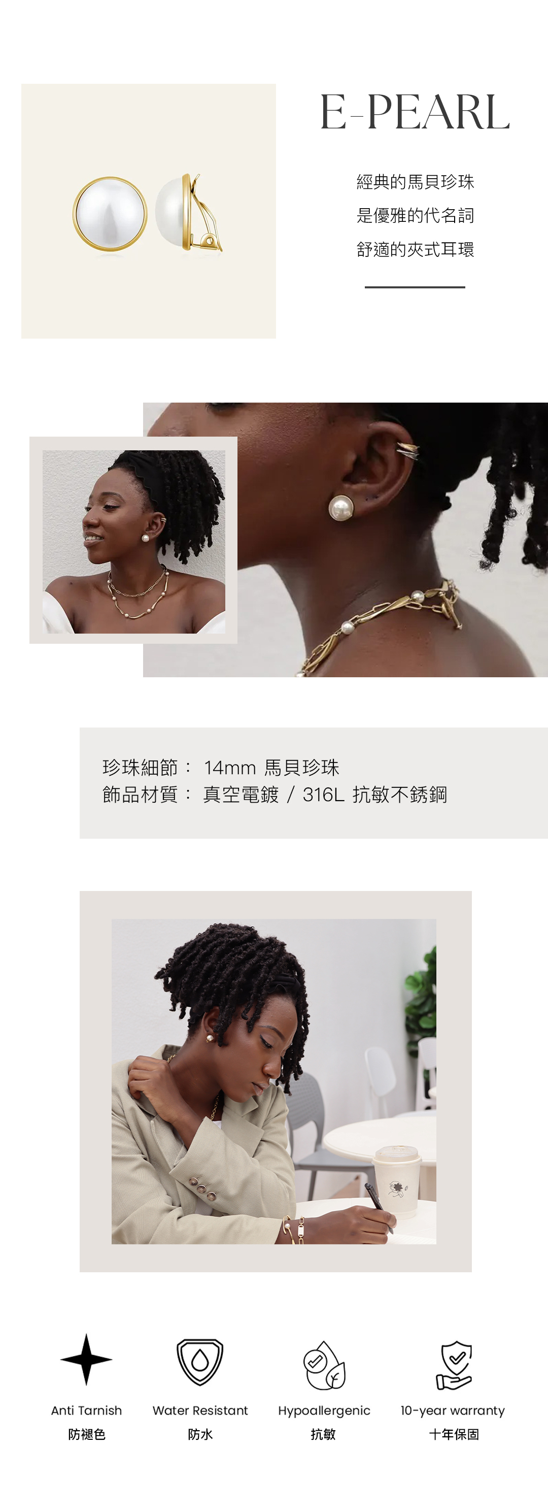 經典的馬貝珍珠,是優雅的代名詞,舒適的夾式耳環。即便長時間配戴也不會感到不適,是沒有耳洞的您的經典選擇。